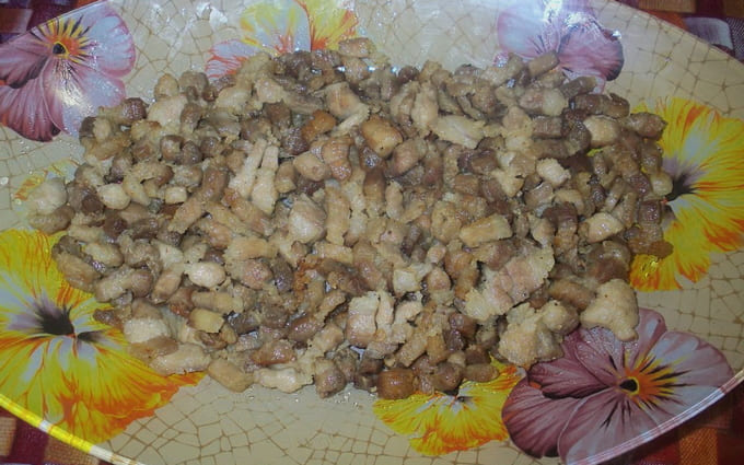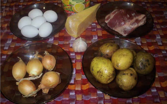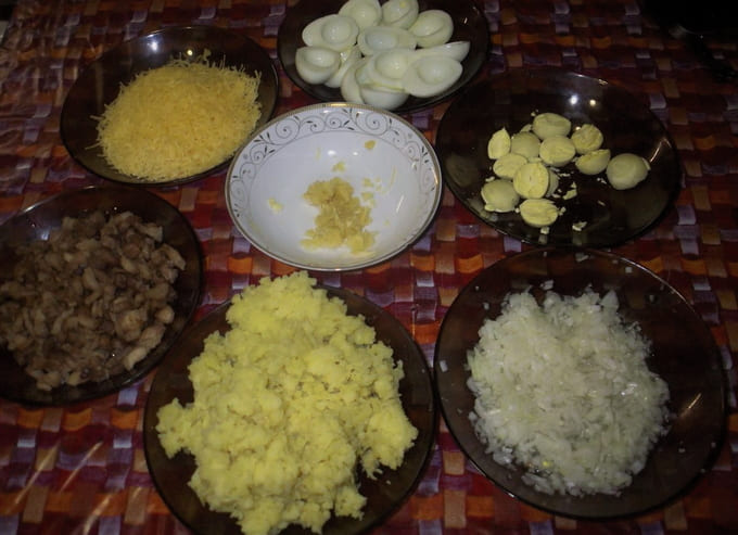 - Snijd de eieren doormidden. We verwijderen de dooiers in een apart bord. Hak de knoflook fijn. We wrijven de kaas. Kneed de aardappelen tot pap en bak de stukjes varkensvlees met zout.