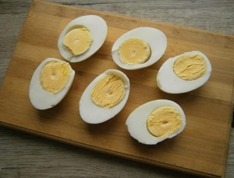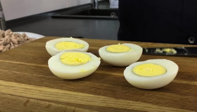 - Snijd de gekookte kippeneieren doormidden.