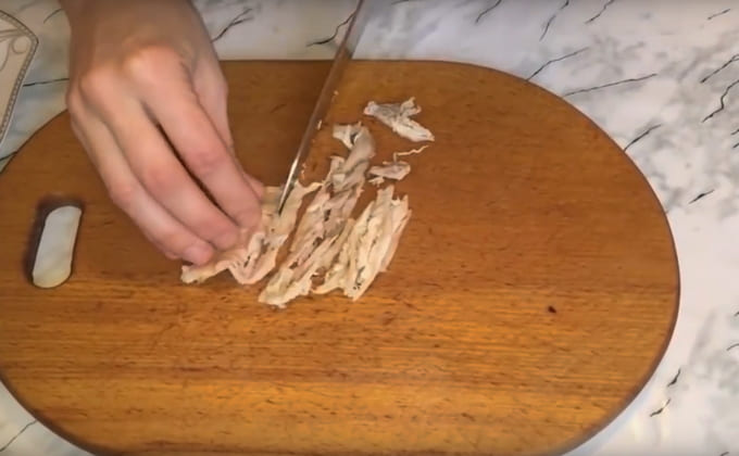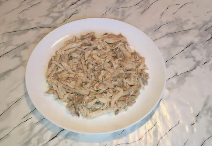 - Snijd de gerookte kip in kleine stukjes. We verspreiden het ingrediënt over de groenten. We bedekken de laag met dressing.