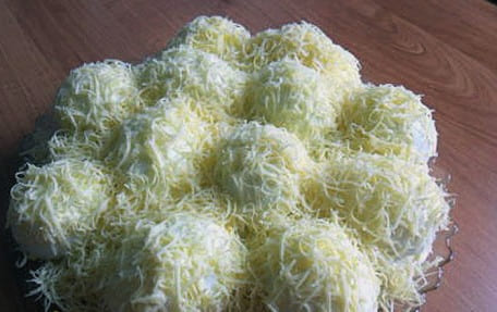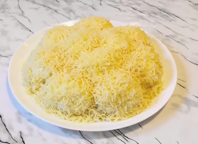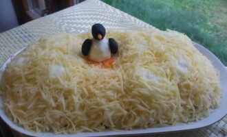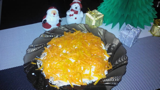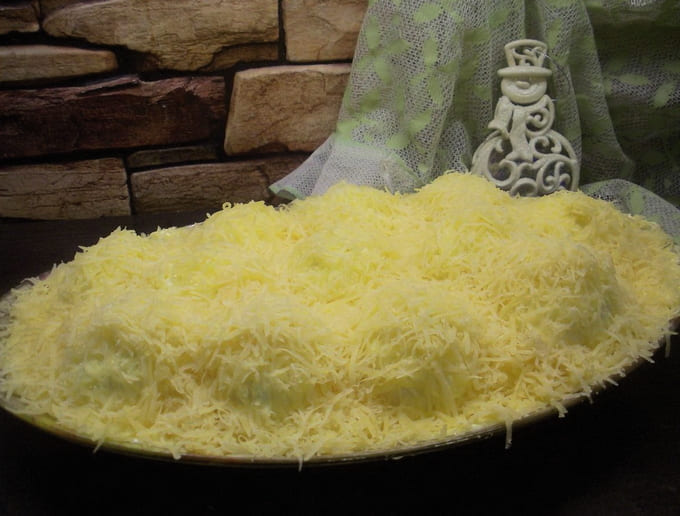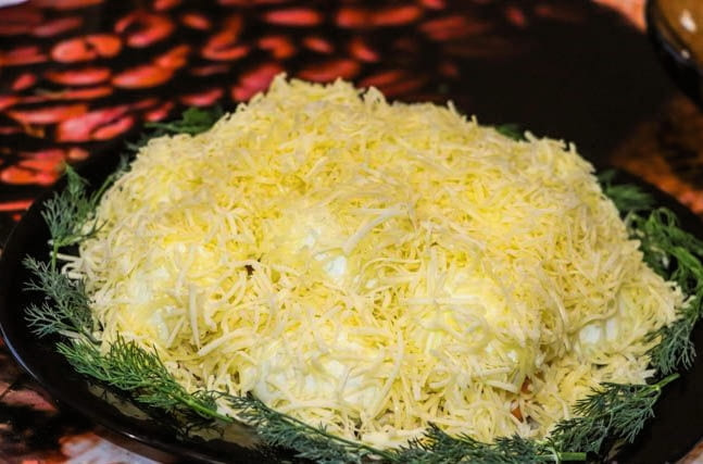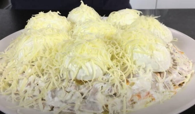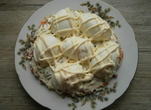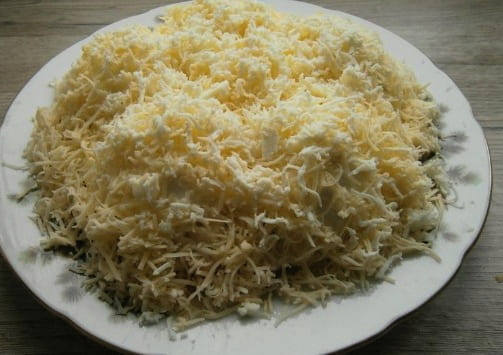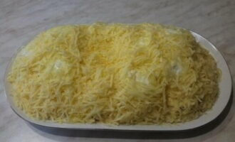 - Bestrooi met mayonaise en bestrooi met geraspte kaas. We koelen de salade en serveren. Eet smakelijk!
