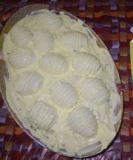 - Vul de eiwitten met een massa dooiers.