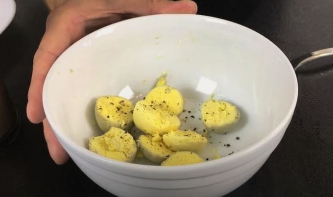 - Haal de dooiers voorzichtig uit de eieren. Dompel ze in een bord en bestrooi met peper.