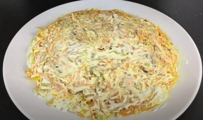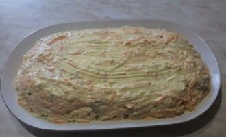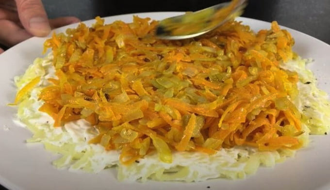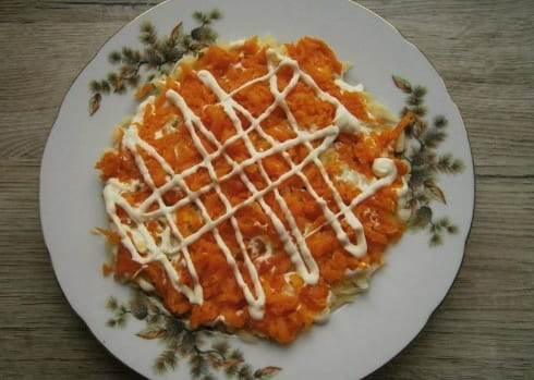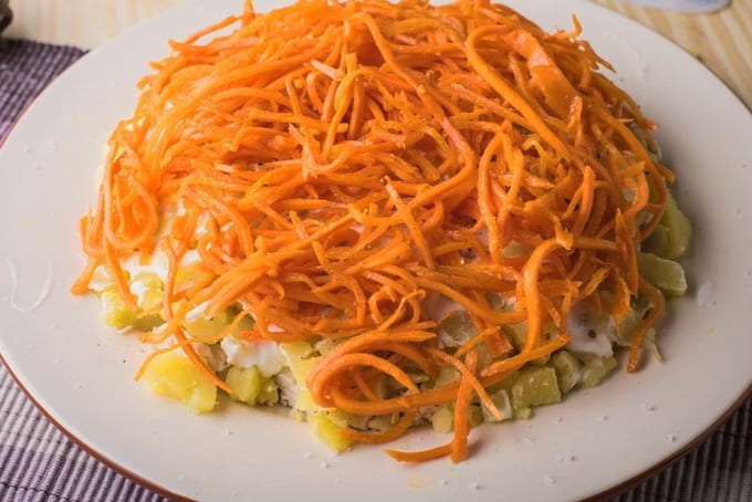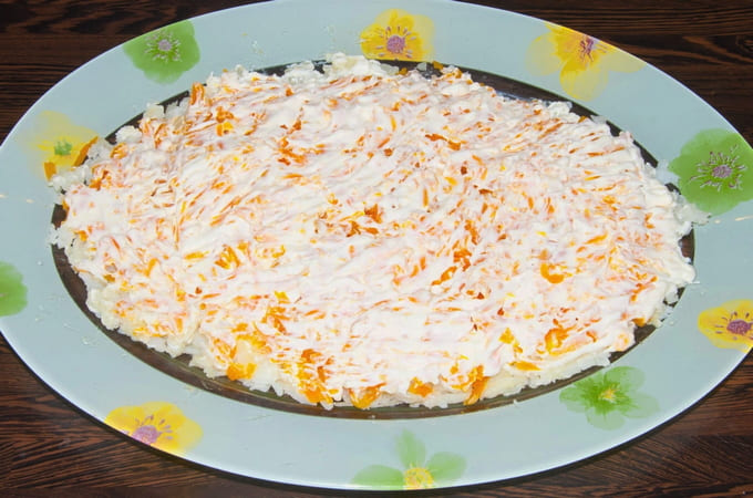- Leg Koreaanse wortelen op de salade. Bedek opnieuw met mayonaise.