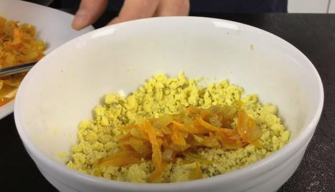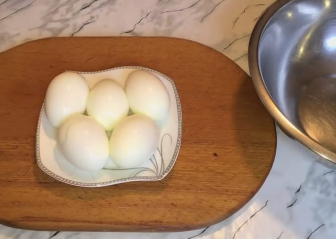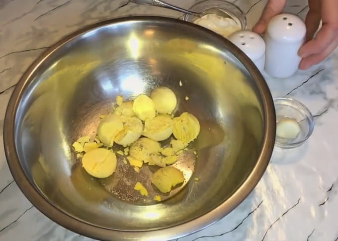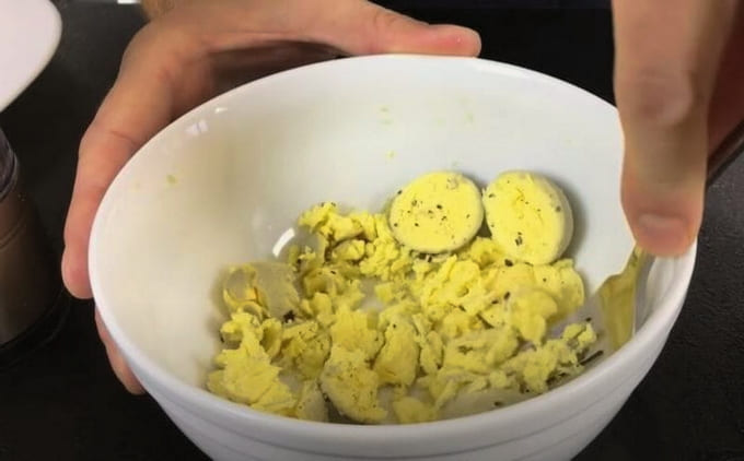 - Kook de eieren, snijd ze doormidden. We extraheren de dooiers, combineren met zout, peper en mayonaise. Grondig roeren.