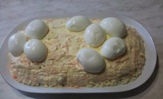 - We koken kippeneieren, verdelen ze in tweeën. Verwijder de dooiers, kneed met een vork met mayonaise en leg terug. We verspreiden het product met de vulling naar beneden.