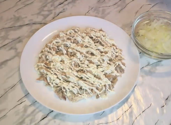 - Simpele en heerlijke salade "Snowdrifts" met kip en ingelegde uien