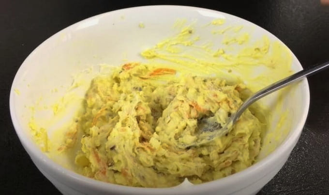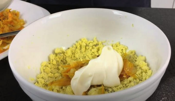 - Giet een beetje mayonaise in de massa.
