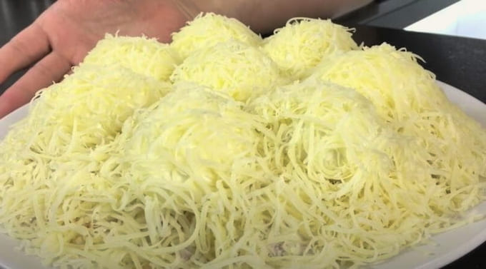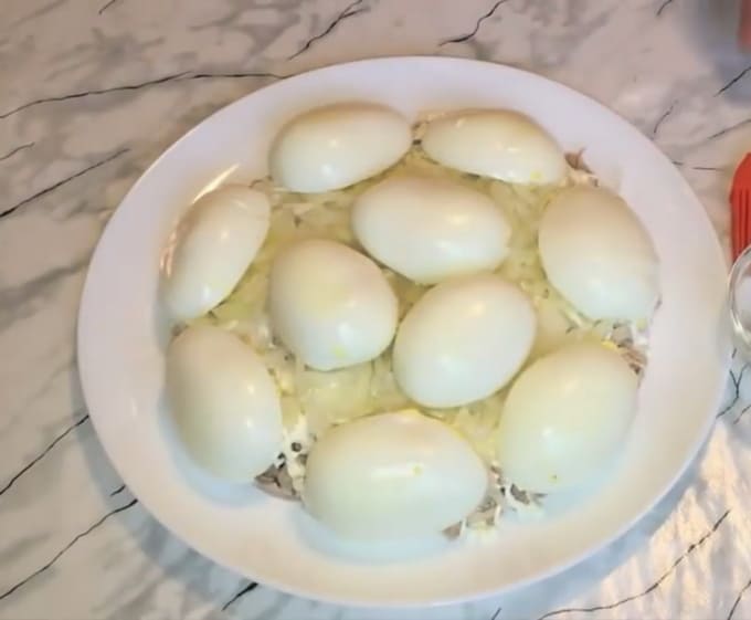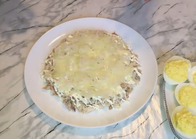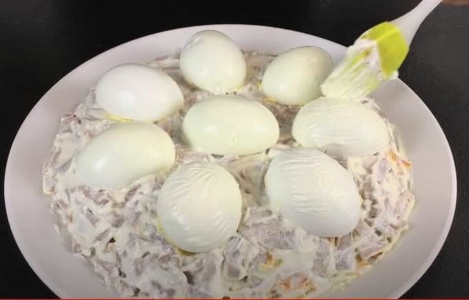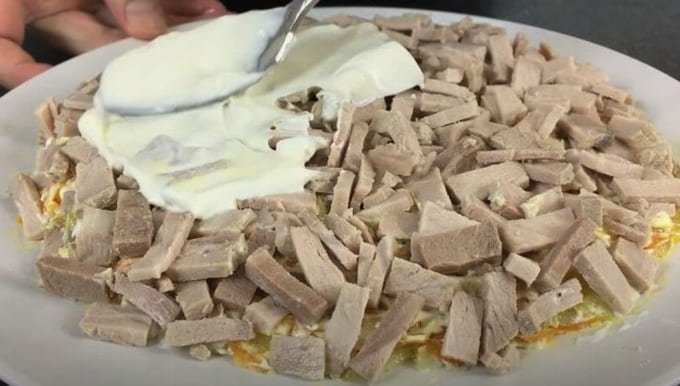 - Kook het rundvlees in gezouten water. Maal het ingrediënt en leg er nog een laag uit. We bekleden met mayonaise.