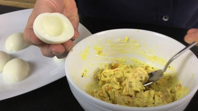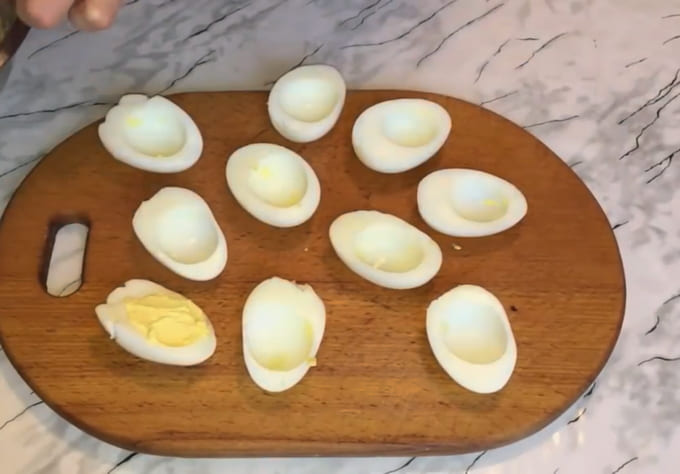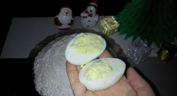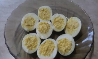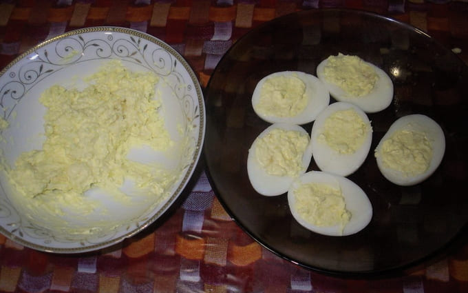 - Kook kippeneieren en verdeel ze in tweeën. Extraheer de dooiers, maal met zout, peper en mayonaise. We verspreiden het terug in de eiwitten.