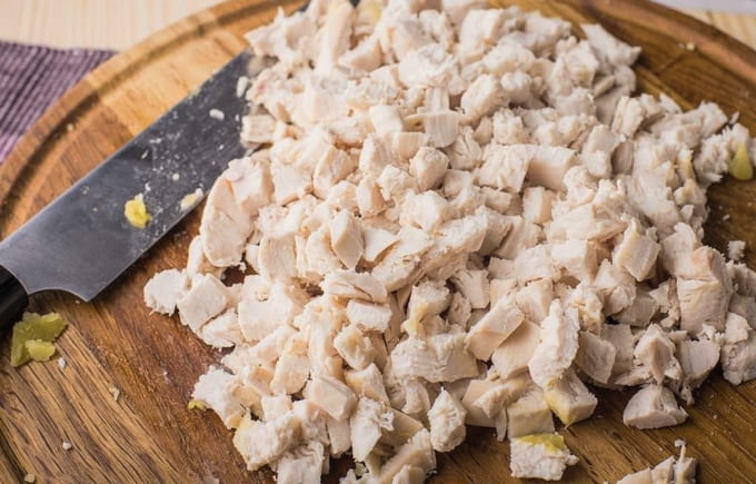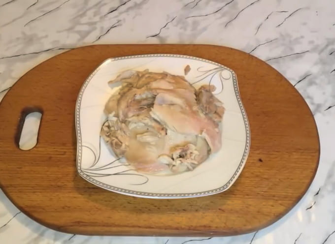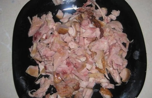 - Kook kippenbouten. Laat ze afkoelen en scheid het vlees van het bot.