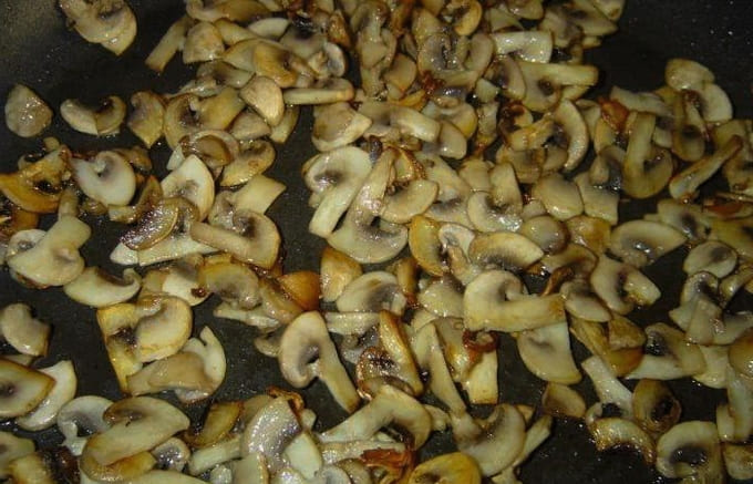 - Snijd de champignons en bak ze tot ze blozend zijn in plantaardige olie.