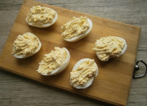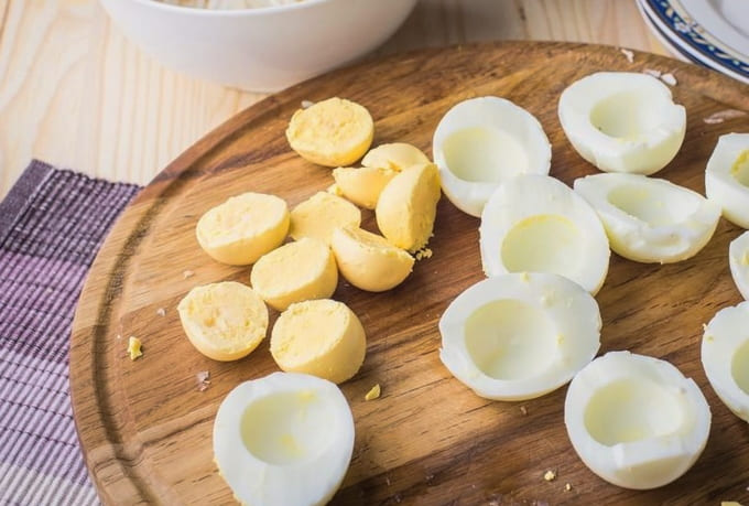 Kook kippeneieren, snijd ze doormidden, verwijder voorzichtig de dooiers, hak ze fijn en meng met een beetje mayonaise en mosterd.