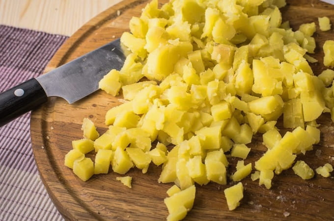- Kook de aardappelen, schil ze en verdeel ze in kleine blokjes.