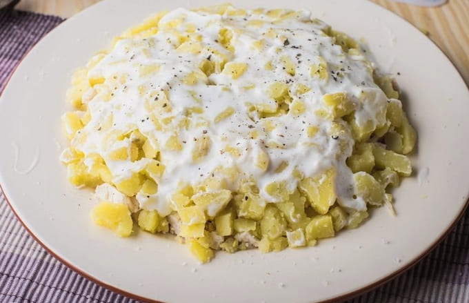 - We vormen de salade in lagen. Eerst verspreiden we de kip, dan de champignons en aardappelen. Bedek met mayonaise en bestrooi met zwarte peper.