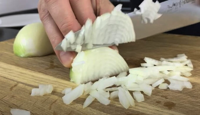 - Pel de uien en hak ze fijn.