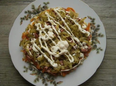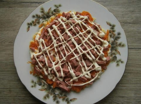 - Snijd de worst in kleine blokjes. We verspreiden nog een laag van het product. Bestrooi met mayonaise.