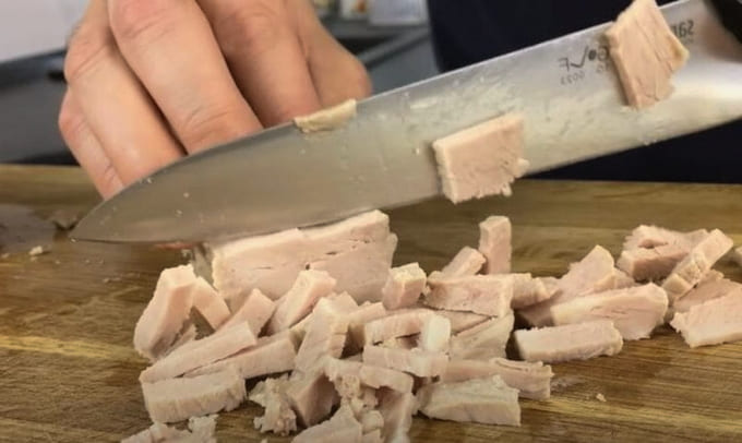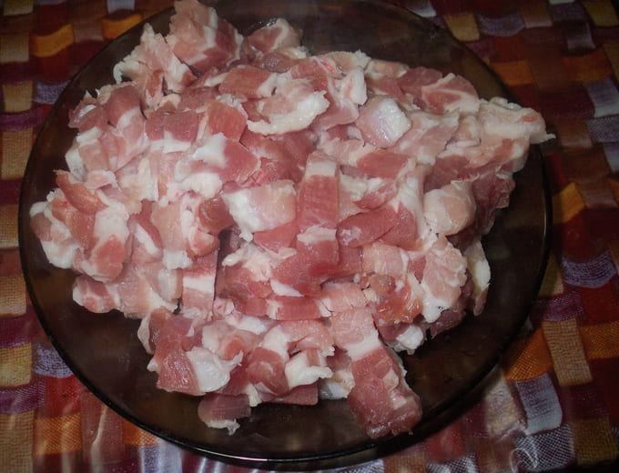 - Snijd het ontdooide stuk varkensvlees in kleine stukjes.