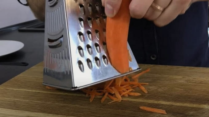 - We schillen de wortels en wrijven ze op een grove rasp.