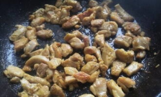 Verwarm een koekenpan voor met een beetje plantaardige olie. Bak hierin stukjes kip tot ze licht blozend zijn.