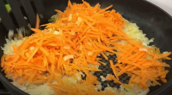 - Voeg wortels toe aan uien. Fruit de groenten tot ze glazig zijn.