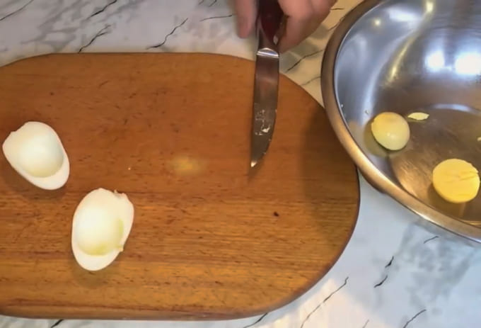 - Snijd de gepelde eieren doormidden.