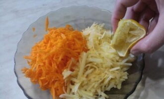 Wrijf de appel en de geschilde wortelen op een grove rasp. Doe een paar citroendruppels bij de ingrediënten.
