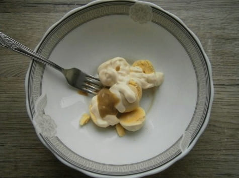 - Verwijder de dooiers voorzichtig en doe ze in een aparte kom. Voeg hier wat mayonaise en mosterd aan toe.