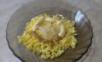 - Giet de eieren met mayonaise en bestrooi ze met harde kaas.