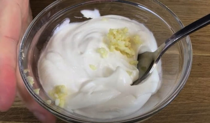 - Giet mayonaise in een diep bord. Voeg hieraan gehakte knoflook toe. Roer de inhoud goed door.