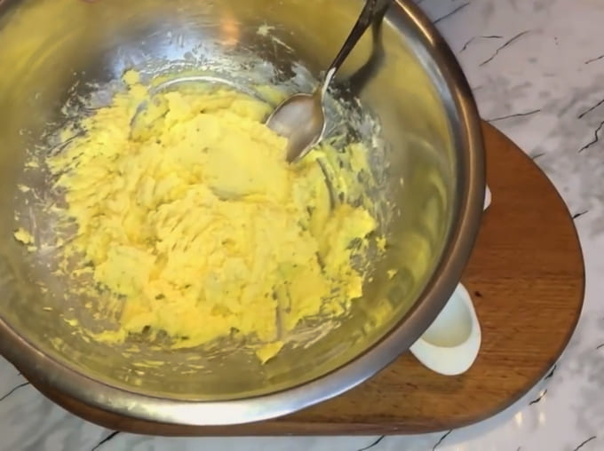 - Kneed de dooiers met een beetje mayonaise. We vullen de helften van de eiwitten met pap.