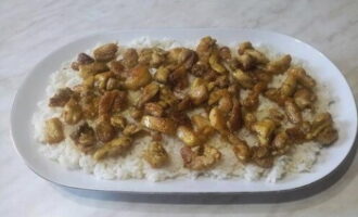 Leg stukjes kippenvlees op de rijst.
