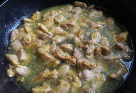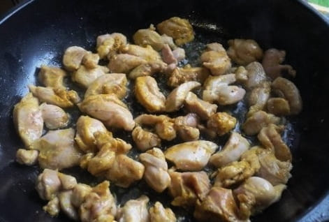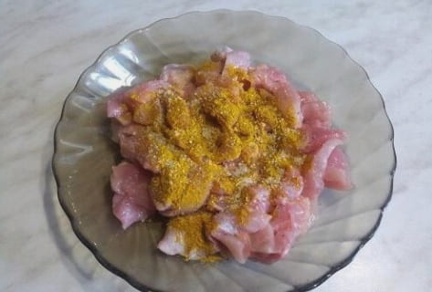 Haal het vlees van de kippenpoten, snijd het in kleine stukjes en marineer in een mengsel van zout en kerrie.