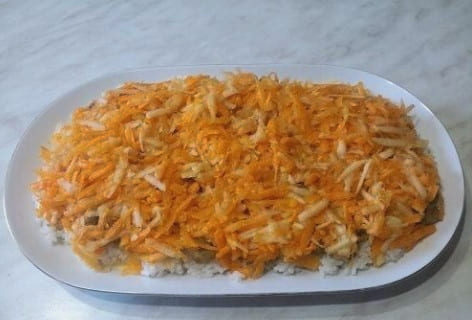 - Passeer de gekookte wortelen door een rasp. We verdelen de groente over de salade en coaten de laag opnieuw.