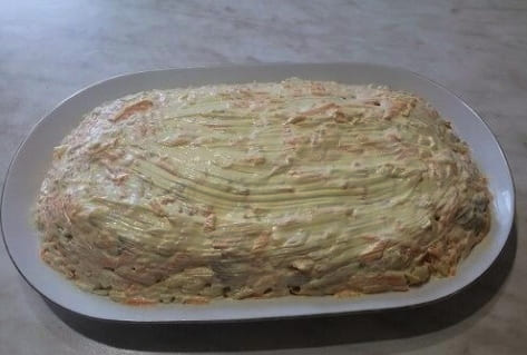 - Leg Koreaanse wortelen op de salade. Bedek opnieuw met mayonaise.