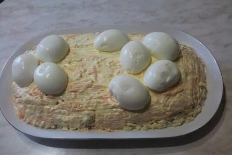 - Kook het rundvlees in gezouten water. Maal het ingrediënt en leg er nog een laag uit. We bekleden met mayonaise.
