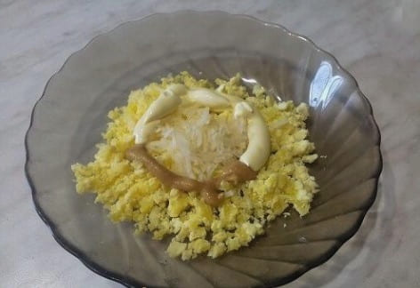 - Kook de eieren, snijd ze doormidden. We extraheren de dooiers, combineren met zout, peper en mayonaise. Grondig roeren.