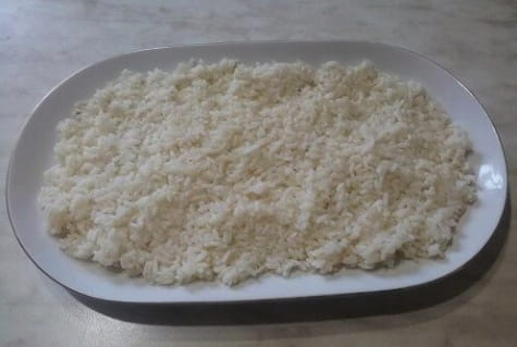 Kook de rijst gaar en verdeel deze in een gelijkmatige laag op een plat bord.