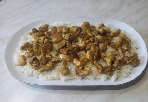 Leg stukjes kippenvlees op de rijst.