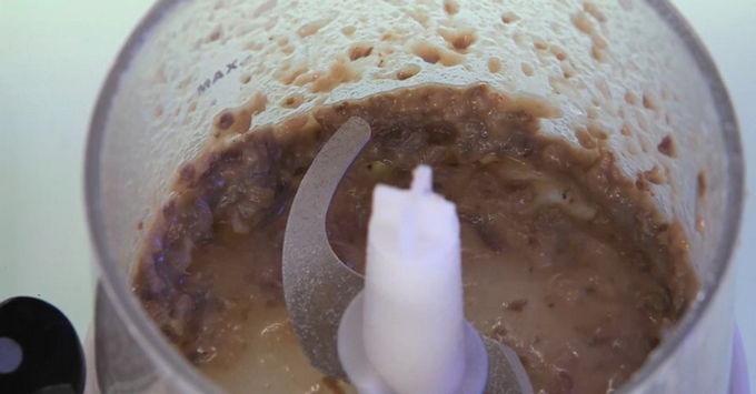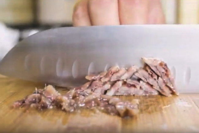 - Hak de ansjovisfilet fijn en voeg toe aan de kom. Dit is een zeer belangrijk ingrediënt en zal de vis een lichte smaak geven. Passeer met een blender tot het volledig homogeen is.