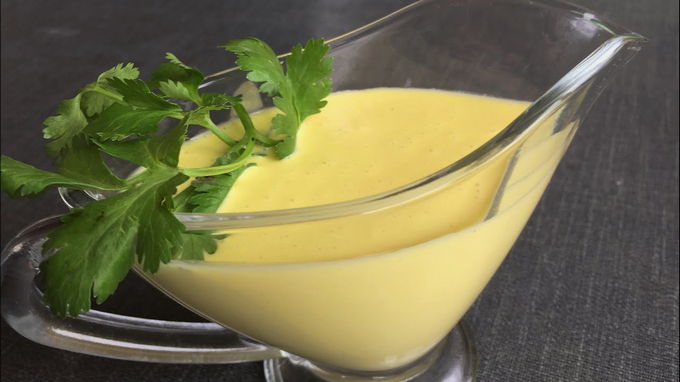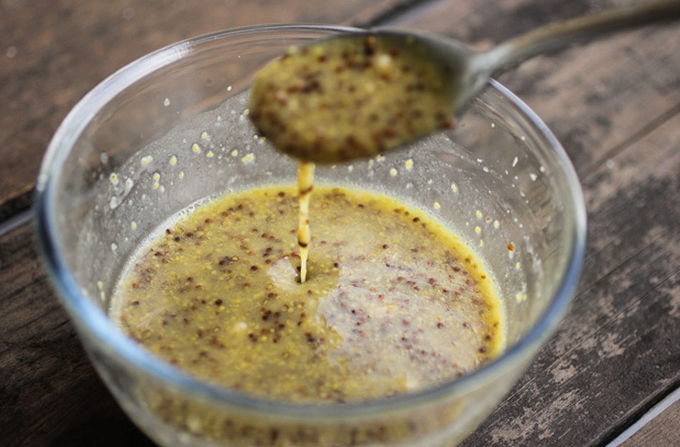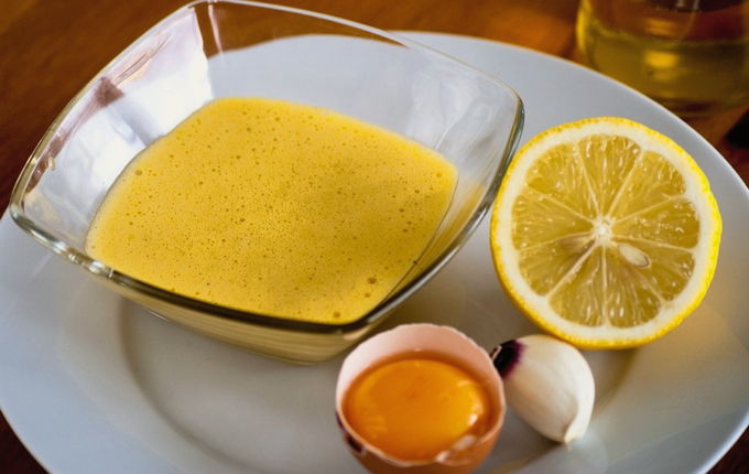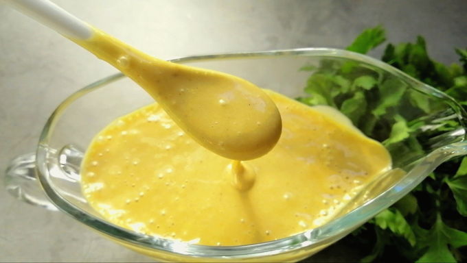 - Doe voor de saus de mosterd en honing in een aparte kom, pers 1 teentje knoflook uit en breek 2 eieren, voeg citroensap toe. Roer met een blender, voeg langzaam 1 theelepel toe. olijfolie en klop opnieuw.