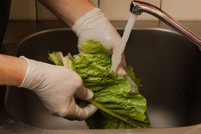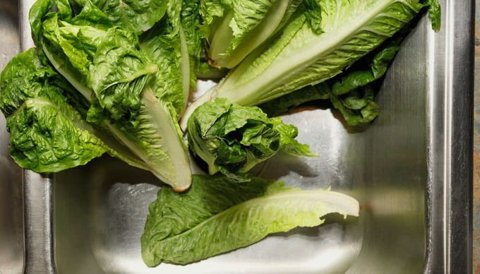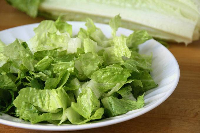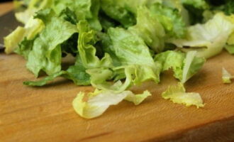 - Verdeel de salade in blaadjes en was ze elk onder stromend koud water. Scheur de bladeren met je handen en doe ze in een diepe kom.