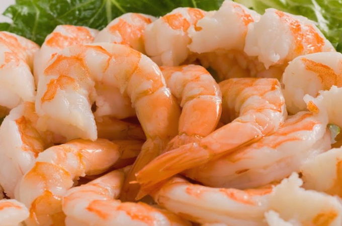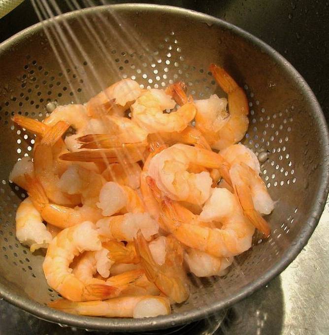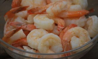 - Gooi de garnalen 5 minuten in kokend water met een beetje zout, droog en verwijder de schaal, pel. Ik raad af om kant-en-klare en gepelde garnalen te nemen, de smaak gaat aanzienlijk verloren.