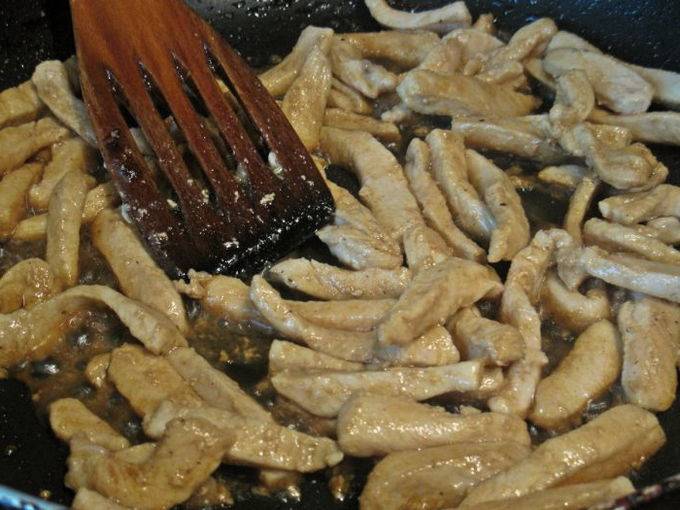 - Snijd de kipfilet in de lengte in zeer dunne reepjes en bak ze goudbruin in boter en knoflook.