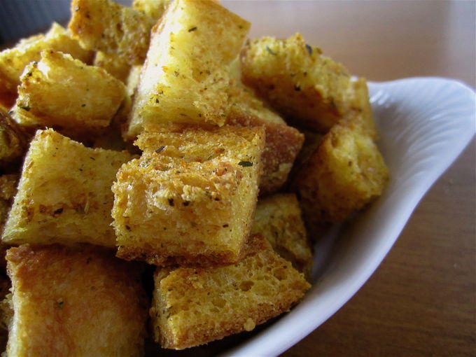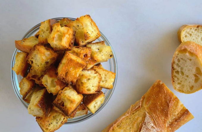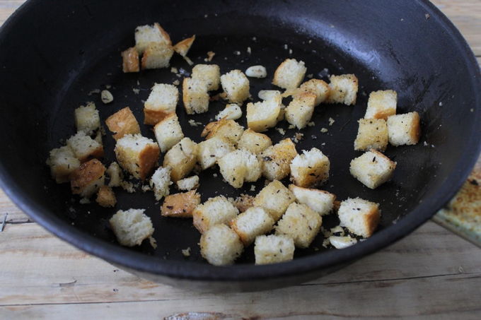 - Bak het in blokjes gesneden tarwebrood in een hete koekenpan met olijfolie en dunne plakjes knoflook. Haal de croutons uit de boter en leg ze op een bord. Gooi de gefrituurde knoflook weg, die komt niet van pas.