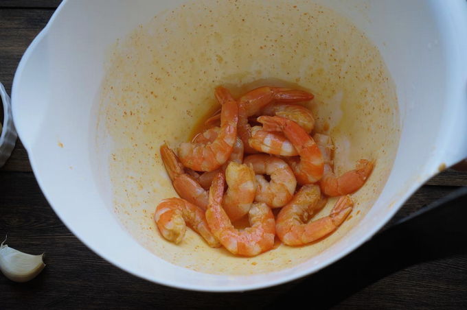 - Ontdooi de garnalen, overgiet met citroensap en laat 20 minuten staan. Bak de garnalen in hete olie direct in de schaal gedurende 3 minuten aan elke kant. Garnalen koelen en pellen.
