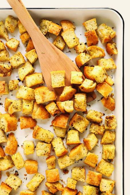 - Snijd het tarwebrood in blokjes en bak ze in een hete koekenpan met olijfolie en stukjes knoflook. Schep de croutons en knoflook uit de boter in een bord.