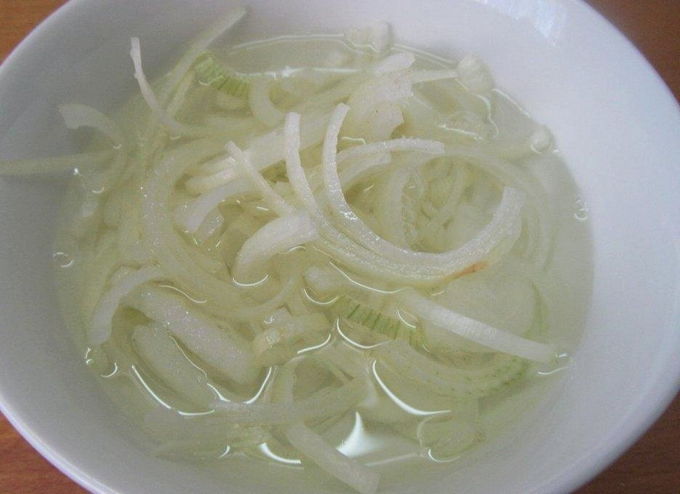 - Snijd de ui in halve ringen, knijp een beetje uit en marineer in 1 eetl. ik. azijn een half uur.
