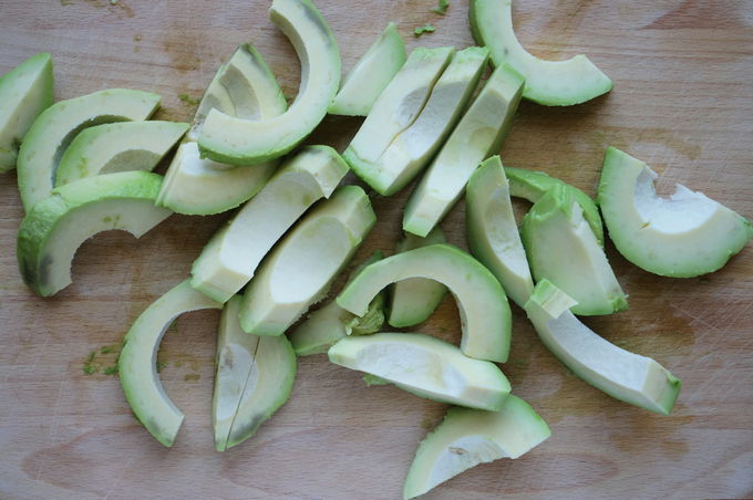 - Was de avocado en scheid hem van de steen, snijd hem hiervoor in tweeën en draai de helften 90 graden, pluk het bot van de andere helft met een mes. Verwijder de schil van de vrucht en snijd in halve ringen.
