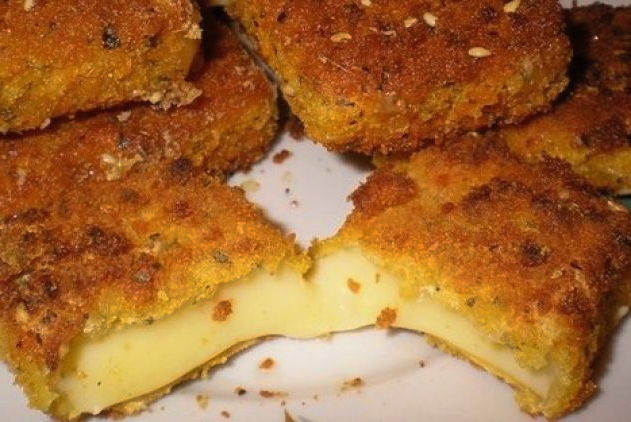 - Snijd de kaas in kleine blokjes, dip in een ei, rol door paneermeel en bak in een grote hoeveelheid boter. Breng over naar een bord met een servet om overtollig vet te verwijderen en zelfs heet - bestrooi met sesamzaadjes.