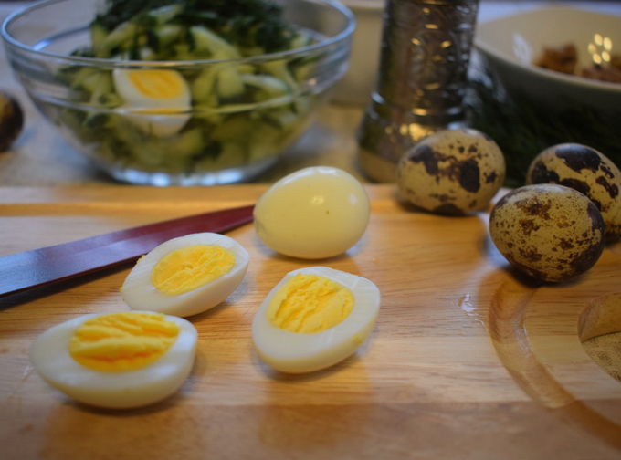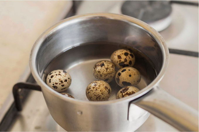- Zet de kwarteleitjes aan de kook. Leg tegelijkertijd de garnalen in kokend gezouten water met 5 peperkorrels en een klein bosje dille. Kook ze niet langer dan 30 seconden, giet het water af, pel de schaal en darmen eraf. Pel de eieren.